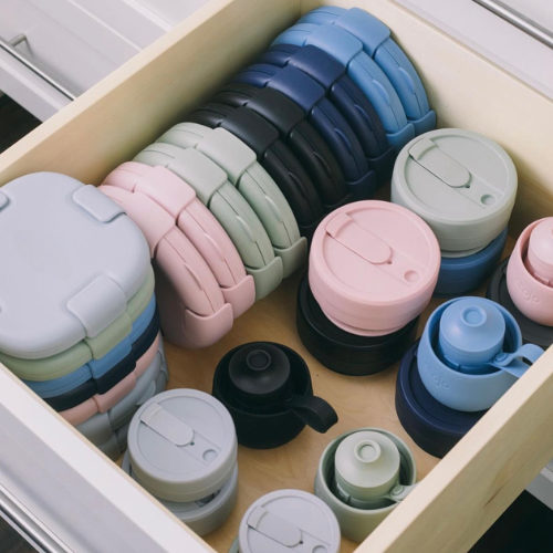 To collapse your EasyTup™ Collapsible Infinity Cup: Open the tab, push cup down to collapse, close your tab, and stow your cup in your pocket, bag, or cabinet!